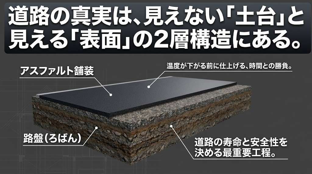 「道路を作る=アスファルトを敷く」と思われがちですが、実はその前の「土台作り」こそが、道路の寿命と安全性を決める最も重要な工程です。