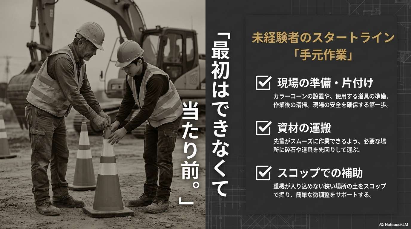 働きながら重機の資格を取り、手作業メインの「土工」から、機械を自在に操る「重機オペレーター」へとステップアップしていく。